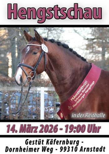 Yeahhhh Bundeschampioness!!! Tara, 5jährige STSW von Epilog wird heute in Moritzburg Bundeschampioness. Wir gratulieren ganz herzlich der Besitzerin Christiane Herzberg-Kaufung zu dieser tollen Stute und auch dem Fahrer Karl-Heinz Finkler für die tolle Vorstellung. Süddeutschen Körung in Neustadt (Dosse) 2014Unser Junghengst von Quadroneur-Placido wurde zur Süddeutschen Körung in Neustadt (Dosse) 2014 zum Dressurprämienhengst gekürt. Von 7 gekörten Dressurhengsten konnte er sich eine der beiden verliehenen Prämien sichern. Nun wünschen wir ihm bei seinem neuen Besitzer viel Glück und eine erfolgreiche Laufbahn als Dressurpferd. ![]() Herzlich Willkommen im "Gestüt Käfernburg" am Rande von Arnstadt, dem "Tor zum Thüringer Wald". Seit 1956 wird hier Pferdezucht betrieben. Gestandene Stutenstämme bilden die Grundlage für qualitätsvolle Nachzucht. Aus eigener Zucht stehen laufend junge Reit-, Fahr-. Sportpferde sowie Zuchtstuten zu jeglichem Verwendungszweck zum Verkauf. Außerdem bieten wir an: ![]() - Pension für Pferde in geräumigen Boxen |